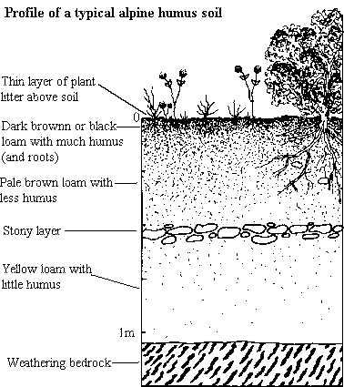 Located on the higher ridges of the alps are the sparse sandy lothosols. The plants that occupy these upper regions of the alps grow slowly because of the cold climate and paucity of nutrients. Dead biomass decompose slower as bacteria and fungi prefer warmer conditions and better nutrients in order to act as efficient decomposers.![]()